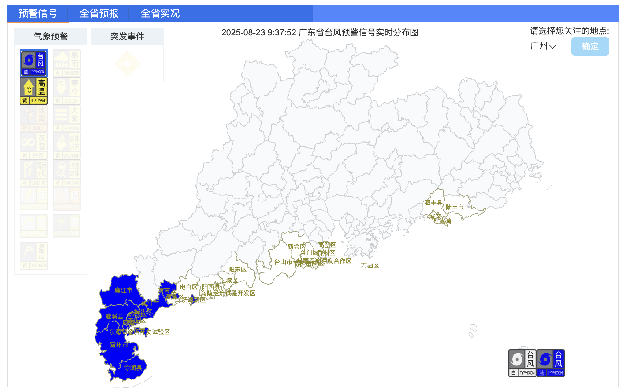 截至8月23日9时37分,广东部分地方已升级台风预警信号,其中雷州半岛多地已将台风白色预警信号升级至台风蓝色预警信号;汕尾、珠海、江门、阳江、茂名等地,有市县区发布台风白色预警信号。广东省气象台23日预计,23日余下时间,珠江三角洲、粤西、汕尾和揭阳市县多云转(雷)阵雨,局部大雨或暴雨;其余市县多云,局部有(雷)阵雨。大部分市县最高气温介于33~37℃。
